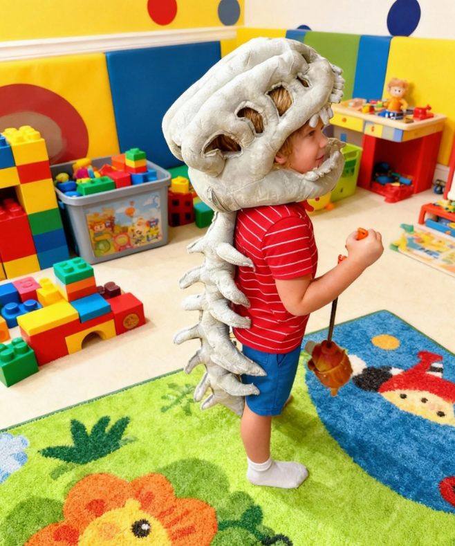 Главата е изработена с триизмерна костна форма и драматичен израз — слагаш я и моментално ставаш „NPC от динопарка“ 🎭.