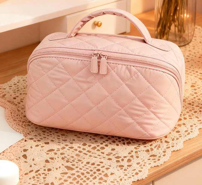 Машинно пране: Меката подплата от пухкава материя предпазва крехки предмети и е устойчива на смачкване. Може да се пере в пералня за лесно почистване, което прави тази пътна козметична чанта дълготраен спътник.